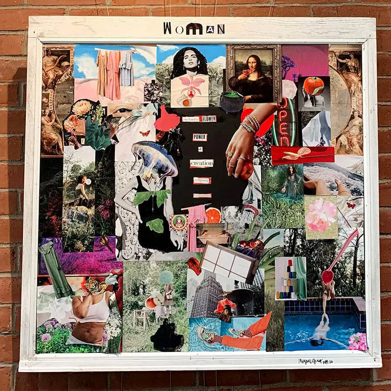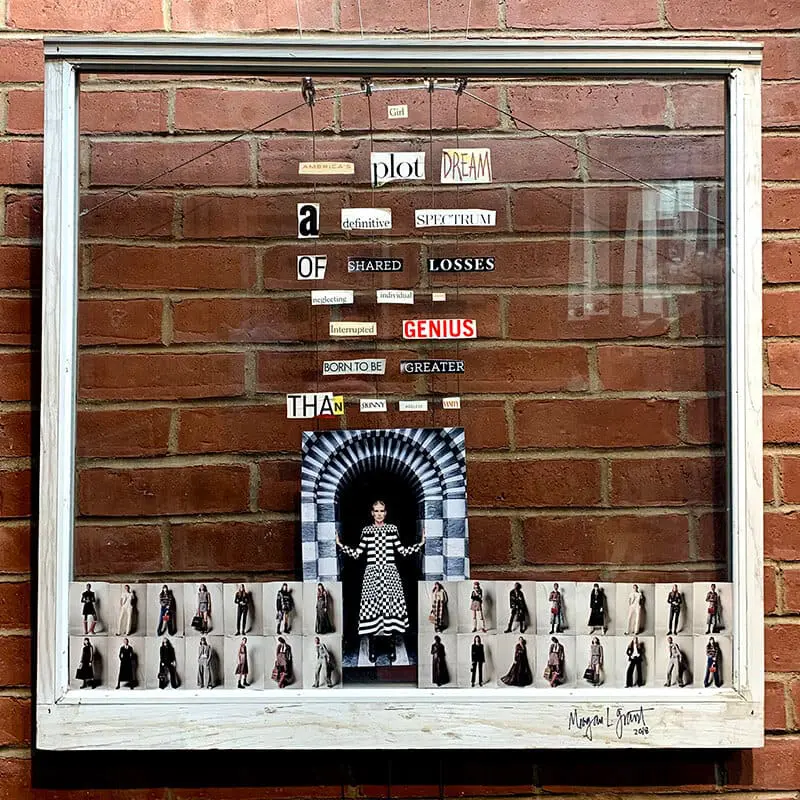 The exhibit is based upon “found poetry,” a type of poetry created by taking words, phrases, and sometimes whole passages from other sources, then reframing them in a sort of literary collage. The process involves making changes to spacing and lines or adding and deleting text to impart a new meaning. For Through the Looking Glass, the group is displaying their poetry on windows taken from the rectory of the former Sacred Heart Church and along the roadsides of Gloucester. Grant’s two pieces, “Woman” and “Girl,” are both pictured.