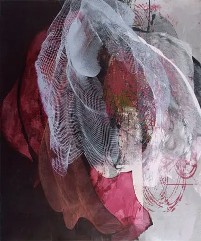 Much of Van Camp’s work addresses the intersection of the body and technology. To demonstrate this overlap, the artist began incorporating vector-based computer drawings into her prints. The printed mark as always been an important presence in Van Camp’s work, but how she has adapted her process to achieve the kind of a tangible relief texture that is distinctively her own. To achieve this, Van Camp experimented with laser-cut stencils, lithographic transfers, and finally screen-printing to successfully transfer the digital renderings. Ultimately, the artist found success in using thickened oil paint printed into a wax ground, to produces a rich relief texture. Van Camp says her unique process, “makes a clear separation from digital output while also suggestive of a deeply etched intaglio print.”