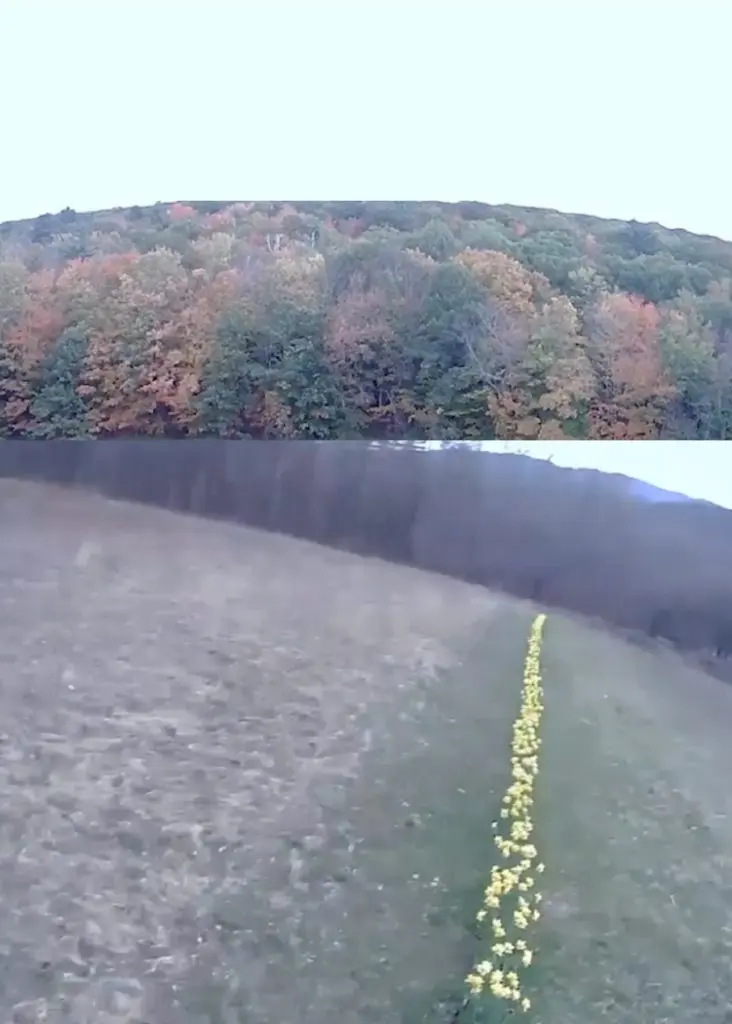 echo 2 is a performative installation in the Green Mountains. Dug by hand, Kantardžić planted 1000 narcissus bulbs in a trench 144ft/44m long, moving thousands of pounds/kilos of earth. Inspired by Richard Long’s 1967 sculpture Line Made by Walking, Kantardžić is interested in human impact on the land, with land understood as the root of conflict. Informed by their family’s refuge to the United States due to the Yugoslav Wars, the artist reappropriates themes and materials of contemporary warfare.