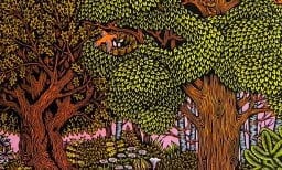 Each completed print exudes energy; gestural, vibrant moments of energy. “Valley” (2014), captures a liminal moment before dawn. As a hawk glides behind a “V” of birds in the lower left-hand corner, the sky sweeps right to left, creating concentric semi-circle formations, each of a different color (light blue, violet, magenta, yellow). Beneath the assortment of hues, a lush valley fills the lower third of the composition. Following the same semicircle shape as the sky above, the valley sustains life of baby seedlings and evergreens beneath the gradient sky.