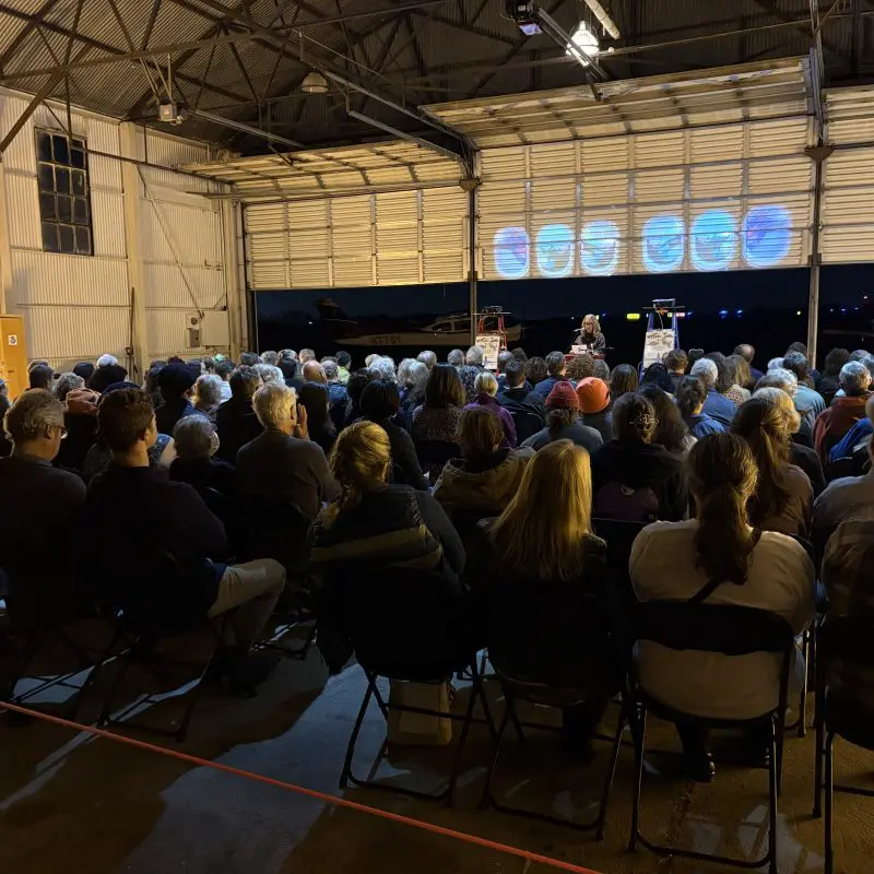 On October 22, 2024, The Beverly Regional Airport hosted a night of poetry. Boarding began at 6:30pm in the main terminal. The reading began at 7pm in an airport hangar that is the site of an intervention by artist Liz Nofziger. The event was free and open to the public.