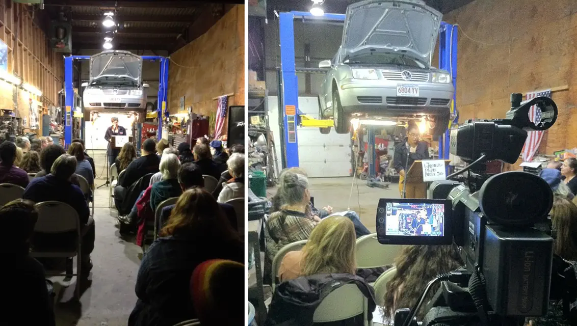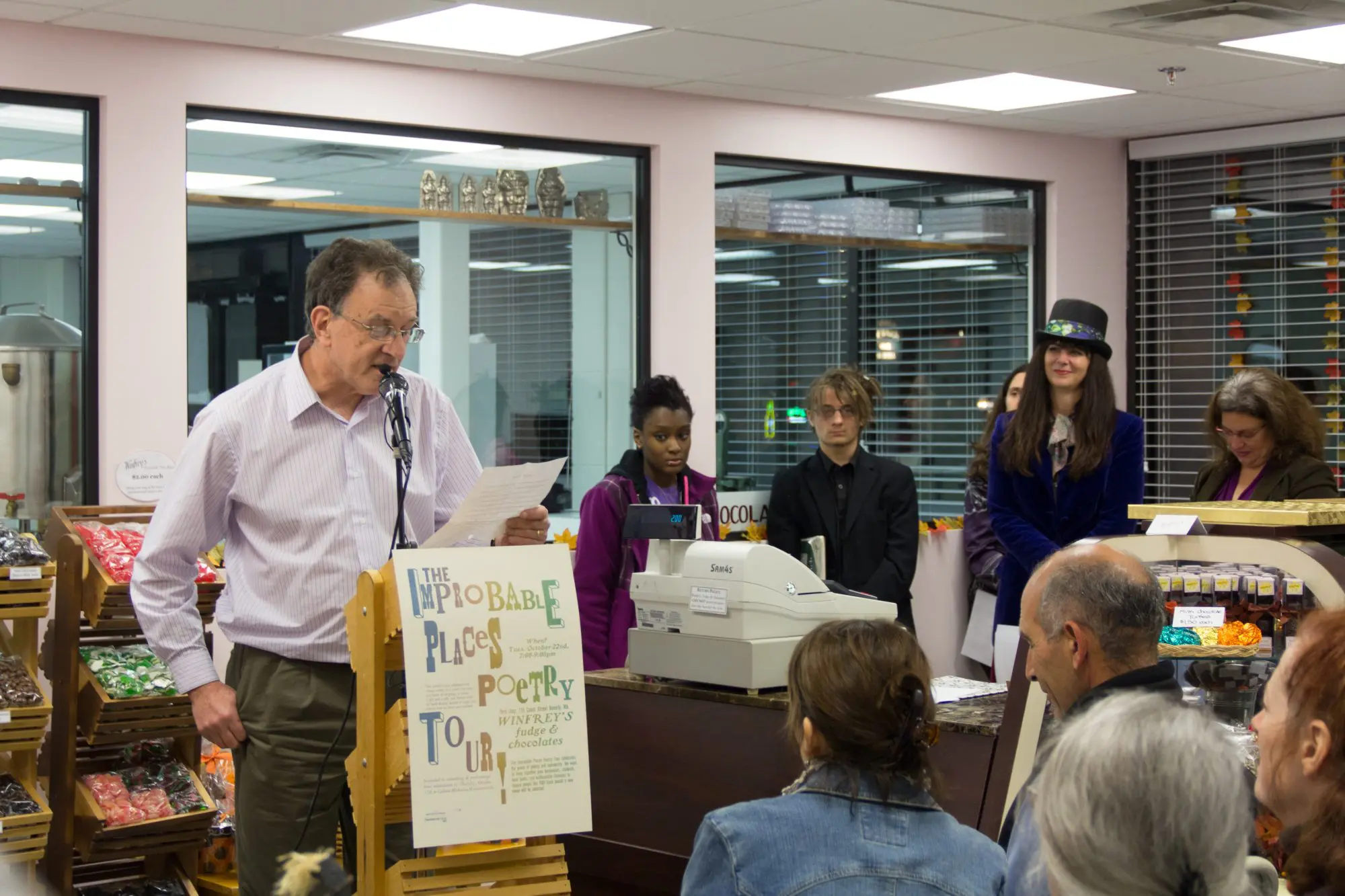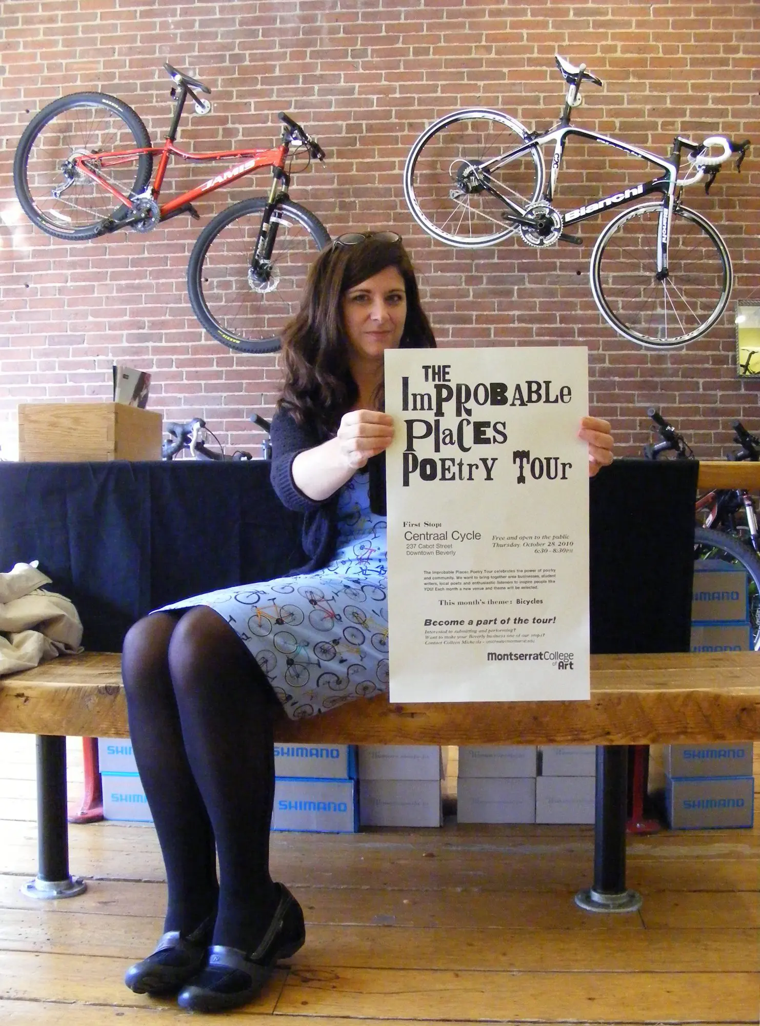 The Improbable Places Poetry Tour is Montserrat College of Art’s way of bringing together poets and enthusiastic listeners to celebrate the power of poetry and community. At each tour stop a new venue and theme is selected. Started in 2010 by Colleen Michaels, the Improbable Places Poetry Tour has traveled from bike shops to power plants, and from tattoo parlors to Viking ships, with a line-up of poets each reading one poem.